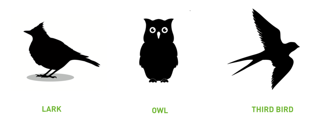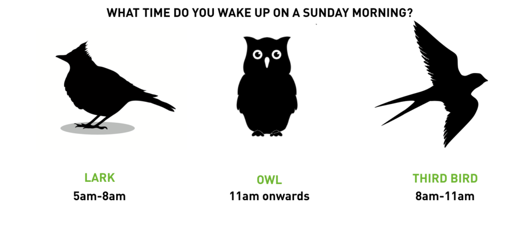 So what does all of this have to do with the kind of bird you are? Your chronobiology differs from individual to individual. And broadly it can be divided into three main types, and hence the bird analogy. To determine what type of bird you are, you have to note what time you wake-up in the morning on a Sunday (this is because you are not likely to be bound by any commitments to work or school and would follow your natural chronobiology).